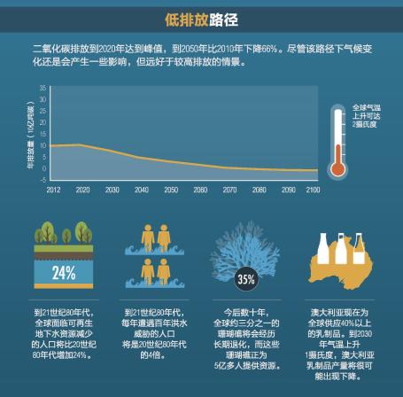 政府间气候变化专门委员会(IPCC)第五次评估报告指出,世界已走上危险之路。气候变化的影响在全球无所不在。如不能大幅减排,全球气温将比工业革命前上升4摄氏度,全球各地都将遭受海平面上升、水资源短缺、生态系统退化及其他气候影响的威胁。