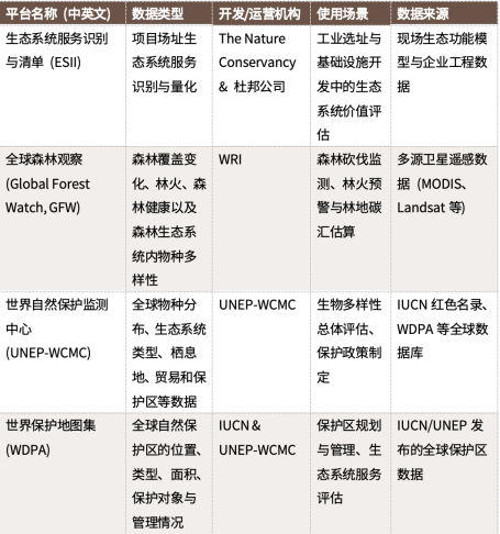 整合多类数据、提供风险评估与决策支持的综合解决方案。它们往往将物种、保护区、生态系统与经济活动数据融合,通过Web界面或API提供分析功能,支持金融机构在项目规划、尽职调查等阶段进行快速筛查。例如IBAT主要提供全球物种分布和保护区数据,供项目快速筛查;ENCORE侧重评估行业与生态系统服务之间的联系;ERST提供中文版工具以符合法规标准;而GFW不仅用于早期筛查,还可通过卫星实时监测项目执行过程中的森林变化。