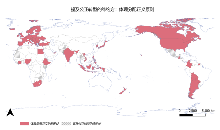大多数提及公正转型的缔约方视承认正义为公正转型的必然要求:近90%提及公正转型的缔约方(70个)响应了该原则。在转型政策中,他们认同或识别了边缘化或弱势群体,或通过包容性方式让这类群体有意义地参与对其产生影响的转型政策制定过程。