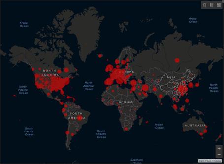 全球新型冠状病毒肺炎累计确诊病例分布 来源:霍普金斯大学COVID-19全球监测平台(2020年4月3日)