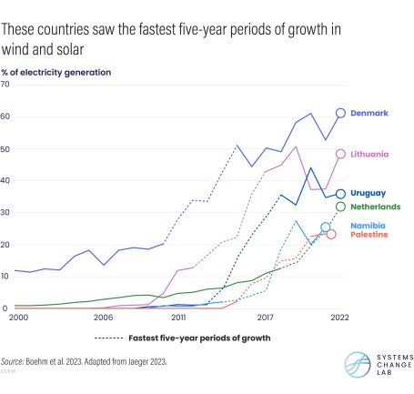 令人欣喜的是,可再生能源发电量增长最快[3]的国家中包括如纳米比亚和乌拉圭等发展中国家:通过扩大风能和太阳能的发电规模,其能源安全得到加强,进一步扩大了电力供应。但客观而言,要实现与1.5°C目标相符的零碳电力目标,可再生能源的增长速度还需大幅提升——太阳能和风能占全球发电总量的比例目前年均增速为14%,但到2030年必须进一步提升至24%。