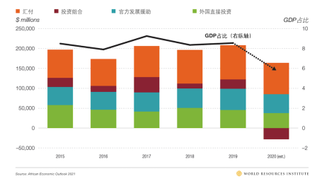 对于它们而言,这无异于雪上加霜。一般来讲,有利的国际支持有助于缓解面对减贫和应对经济危机的资金缺口,然而事实上并不乐观,流向非洲的各类资金已从2017年开始下降(图5)。