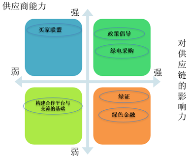 1. 在企业对供应链影响力和供应商自身能力都比较强的情况下(第一象限),企业主要的做法包括绿电采购、政策倡导等。
