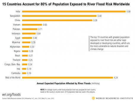 根据受河流洪水影响人口数量,我们对164个国家进行了排序,发现前15个国家占每年受灾总人口的80%。这些国家都属于最不发达国家或发展中国家。中国在最易受到洪水影响的国家中排名第三,每年受灾人数约为328万人。