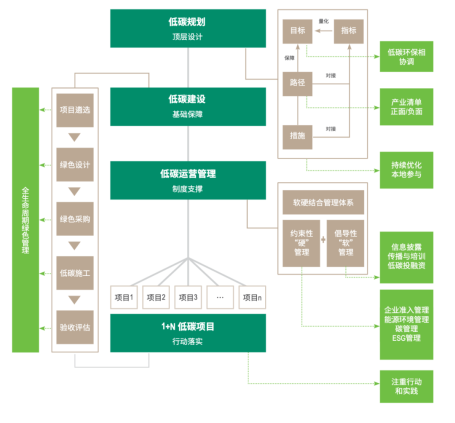 海外园区低碳发展是一项系统性的复杂工程,涉及从顶层设计到落地执行的各个维度。海外园区的低碳行动框架大体涵盖低碳规划、低碳建设、低碳运营管理和低碳项目实施四个方面,以低碳规划为引领,结合建设、运营管理、具体低碳项目识别与实施等流程环节,有步骤有侧重地针对不同类型园区的特征有序推进园区低碳行动,综合提高园区的绿色发展水平。